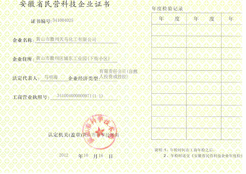 2012年安徽省民營科技企業證書